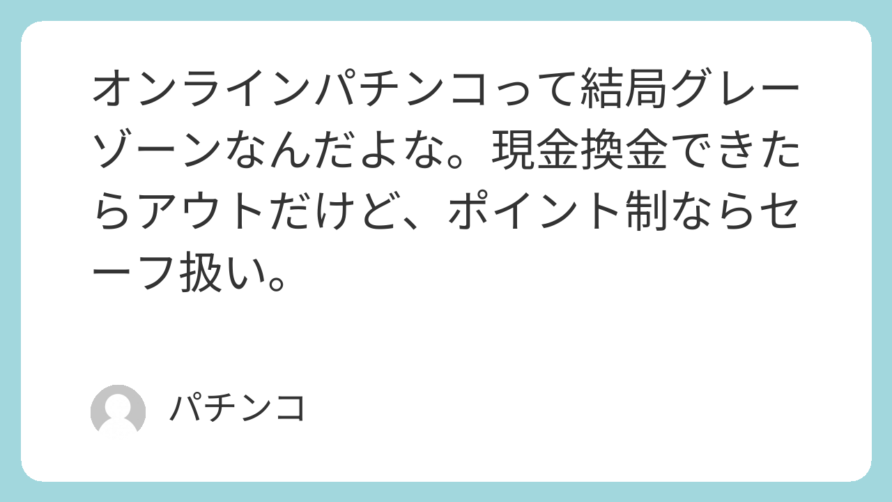 オンラインパチンコって結局グレーゾーンなんだよな。現金換金できたらアウトだけど、ポイント制ならセーフ扱い。