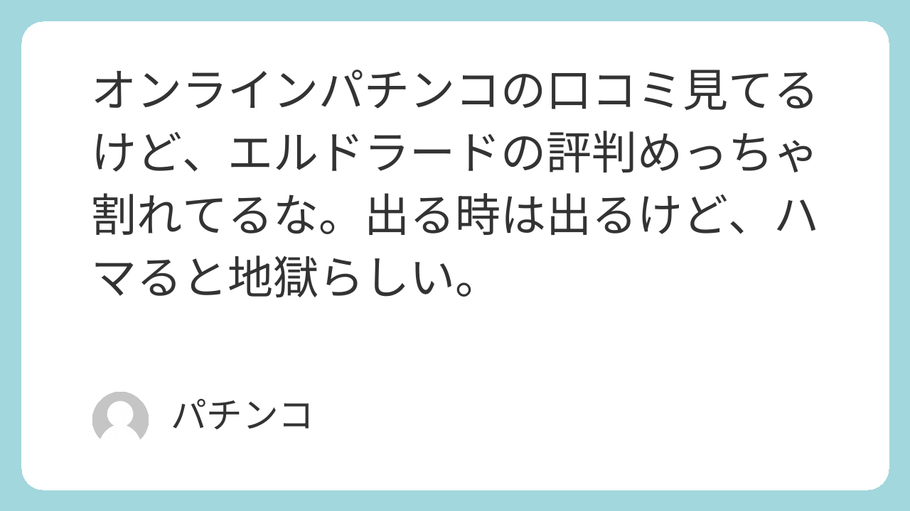 オンラインパチンコの口コミ見てるけど、エルドラードの評判めっちゃ割れてるな。出る時は出るけど、ハマると地獄らしい。